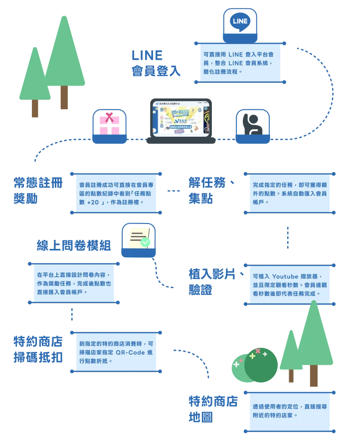 南投縣數位生活點數平台「點點投」,以威許移動的會員系統作為技術基石,結合政府活動、地方觀光、商圈經濟與居民生活諸多場景,打造出便利、靈活、具吸引力的點數兌換平台。從 LINE 快速會員登入,到 多元任務集點、掃碼消費折抵與特約商店查詢,各功能環環相扣,讓集點活動不再只是單一促銷手法,而是融入 政策推廣 與 消費體驗 的日常數位工具。