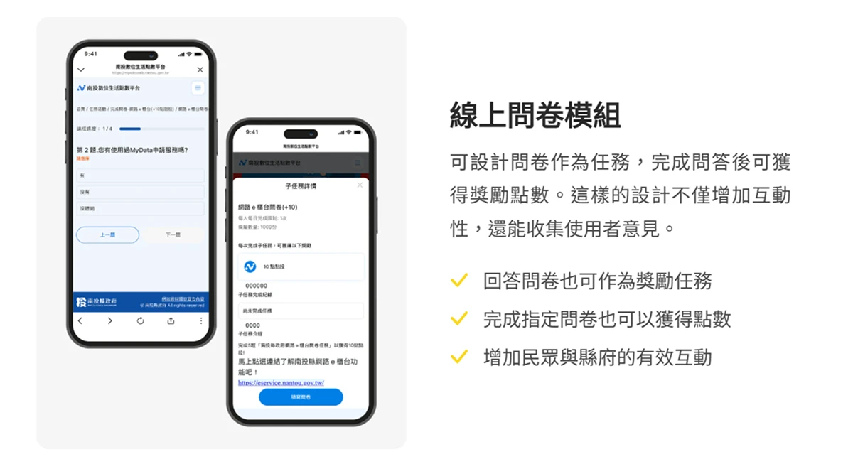 問卷調查是政府單位與點數平台互動的重要工具。南投點數兌換平台設計 專屬問卷模組,讓民眾在參與問卷時同時累積點數。無論是政策意見調查、地方觀光滿意度或特定活動回饋,都能藉線上問券模組快速導入集點活動流程。