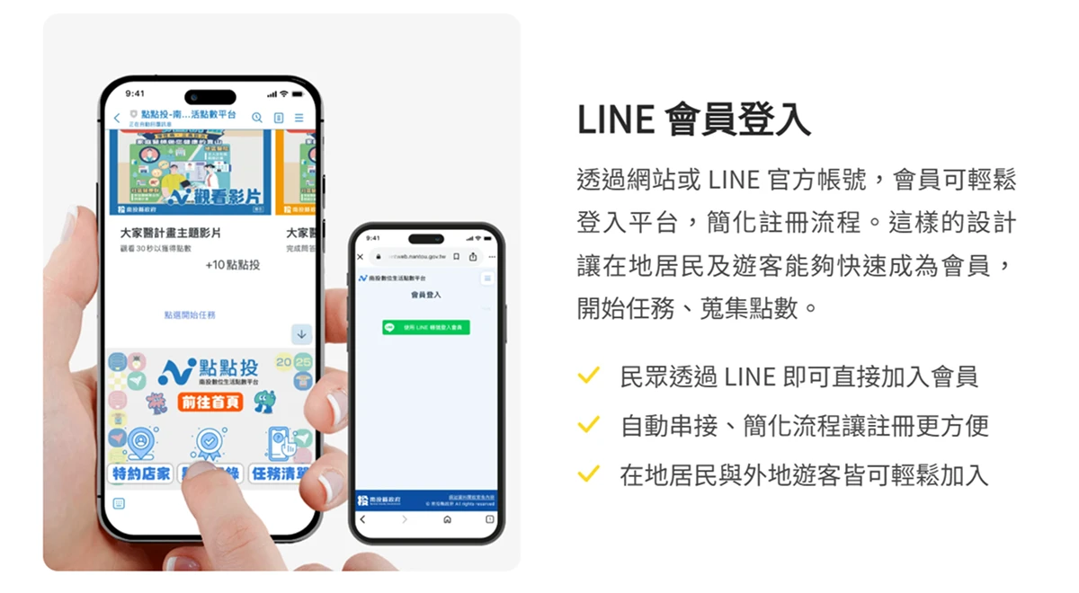 為降低集點活動門檻,點點投採用 LINE 會員 登入機制,居民和遊客可以直接透過 LINE 官方帳號進行註冊與登入,免去繁複表單填寫。這不僅適配當下主流通訊習慣,也結合台灣高普及率的 LINE 應用程式,無論是地方長輩還是外地旅客,都能快速成為點數平台會員。