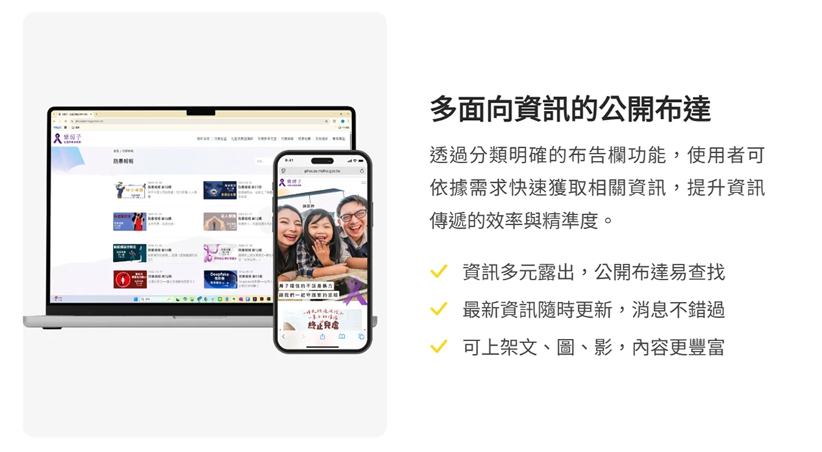 以資訊佈達模組為例,網站製作團隊特別為紫房子設計了多元分類的布告欄系統,讓使用者能根據主題輕鬆瀏覽,無論是新聞消息、活動訊息還是資源轉知,皆能明確掌握。在政令宣導的應用場景中,此功能更展現了政府資訊公開透明的精神,確保即使是資訊焦慮感較高的族群,也能在此平台上獲得清晰、更新迅速的訊息支援。