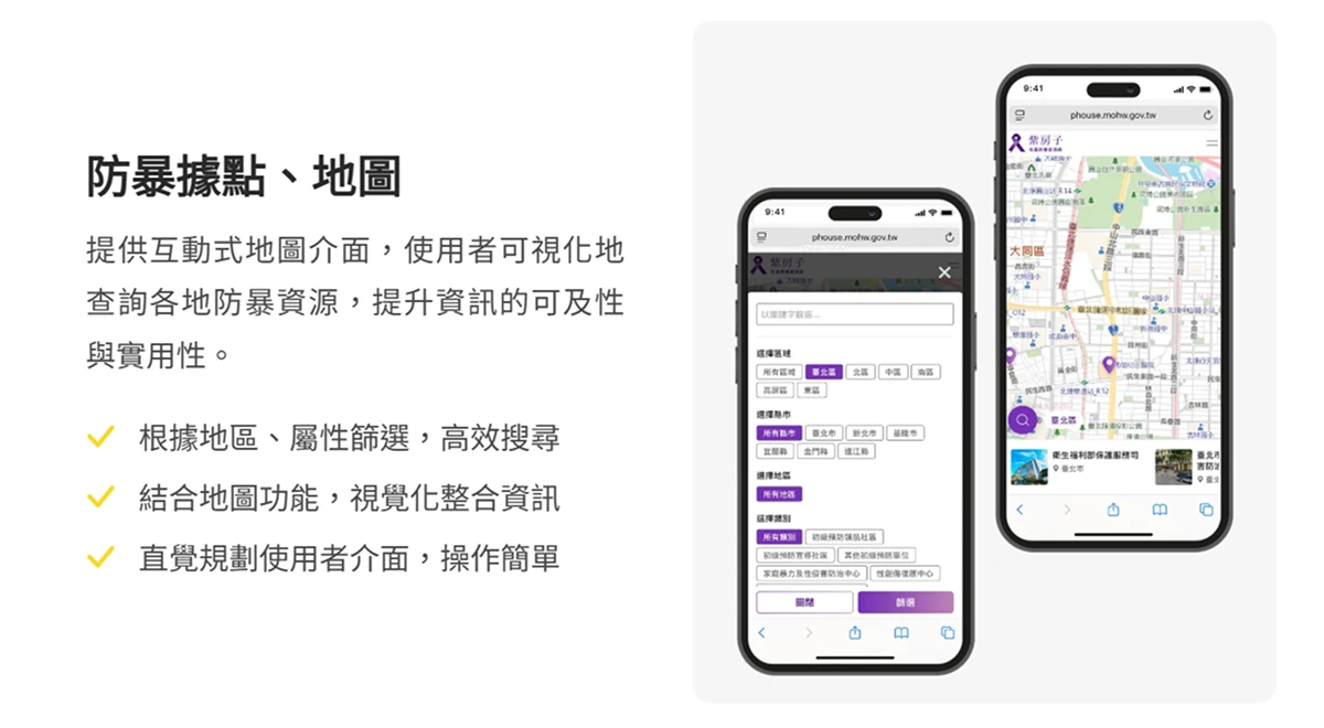 在資訊平台的設計上,紫房子 特別重視「傳遞效率」、「使用便捷」與「個資安全」,並以三大關鍵功能實踐:資訊佈達、防暴地圖與一鍵訂閱。透過這三項設計,使用者不僅能依照需求快速獲取防暴資訊,還能以最直覺的方式找到就近資源,甚至透過 Email 持續接收政府網站釋出的最新訊息,隨時掌握第一線的政令宣導與服務更新。