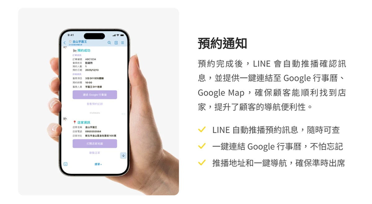為了讓每場做芋圓手作體驗準時無誤,金山芋圓王透過 生活歐巴 LINE 預約系統,會在消費者成功預約芋圓 DIY 課程後,立即自動推播行程確認。通知內容包含芋圓 DIY 手作地點、課程時間、交通提示,以及 Google 行事曆、Google Map 一鍵存取,方便家庭直接整合生活計畫、不再搞錯時間地點。