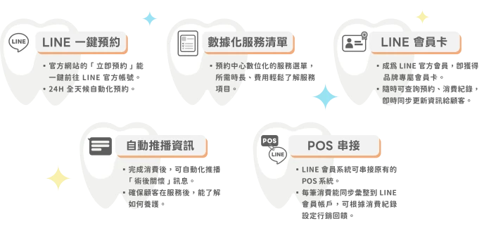 從顧客角度看,整個 預約 體驗更流暢,資訊更透明,關懷更即時。無論何時想做美齒,都能透過 LINE 一鍵完成預約,並在過程中獲得清楚指引與貼心提醒。對品牌而言,則在營運效率與行銷策略上都明顯升級。自動化預約節省人力、電子會員卡降低管理負擔、術後推播提升 顧客關係維護、POS 串接則開啟行銷再互動的可能。這套系統不僅優化了牙齒淨白的服務體驗,也讓淬齒淨白中心能更精準地理解顧客需求,進而優化營運策略。