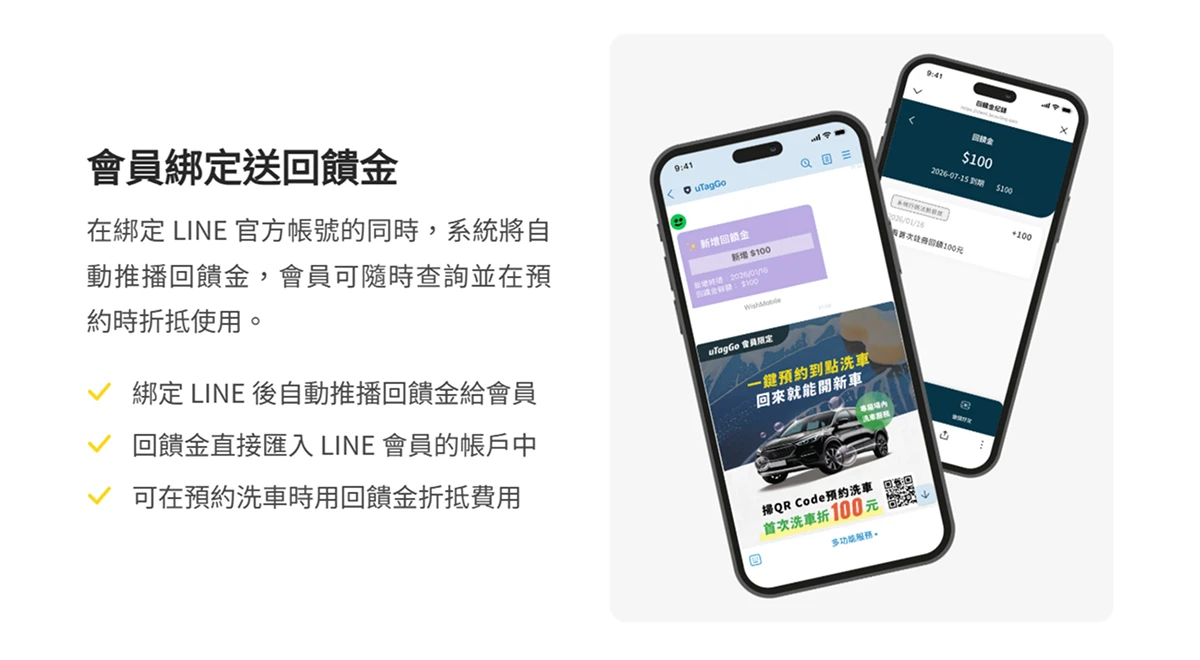 uTagGo 採用 生活歐巴 LINE 預約系統 後,將會員綁定流程與實質回饋制度串聯。當顧客於 LINE 官方帳號完成會員綁定時,系統會 自動推播 回饋金至個人帳戶。這筆回饋金可隨時查詢,並且在預約洗車流程中直接抵扣部分費用。車主只要預約到點洗車,都能同享這份數位回饋機制。