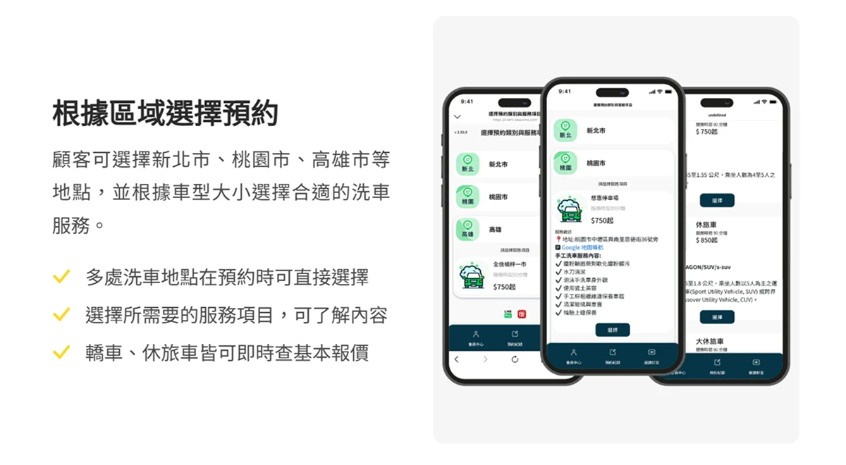 為滿足遍及北中南的車主需求,uTagGo 在預約洗車系統中整合多區域選擇功能。顧客無論在新北洗車、桃園或高雄等地區,都能直接於 LINE 選取需要的洗車場站,再依車型大小 ( 如:轎車、休旅車) 查詢即時價格及基本服務內容。