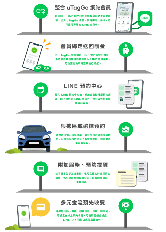 uTagGo 結合 生活歐巴 LINE 預約系統 後,無論在 會員招募、預約流程、金流管理還是回饋制度上,都為車主提供更加便捷的互動旅程。首先,預約洗車的 數位化 處理大幅減少人力成本,車主預約也不受休息時間限制,提升會員黏著度;其次,停車場洗車服務搭配多元預約入口 ( 網站、LINE ) 與線上金流,即便是跨區域移動的車主,皆能享受一條龍式的便利服務。