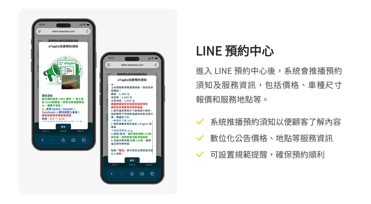 進入 LINE 預約中心後,uTagGo 將完整的停車場洗車資訊以數位化公告方式同步給用戶。這包括詳細的預約須知、服務價格、車型尺寸對應報價、洗車地點或洗車區域選擇等重要資訊。
