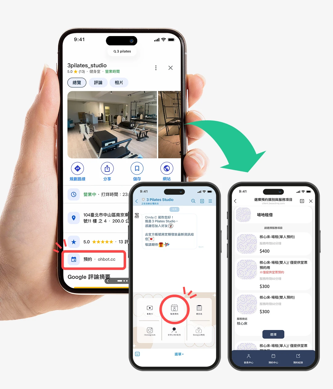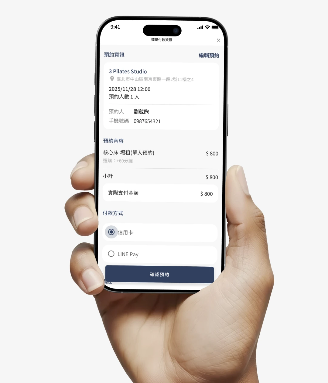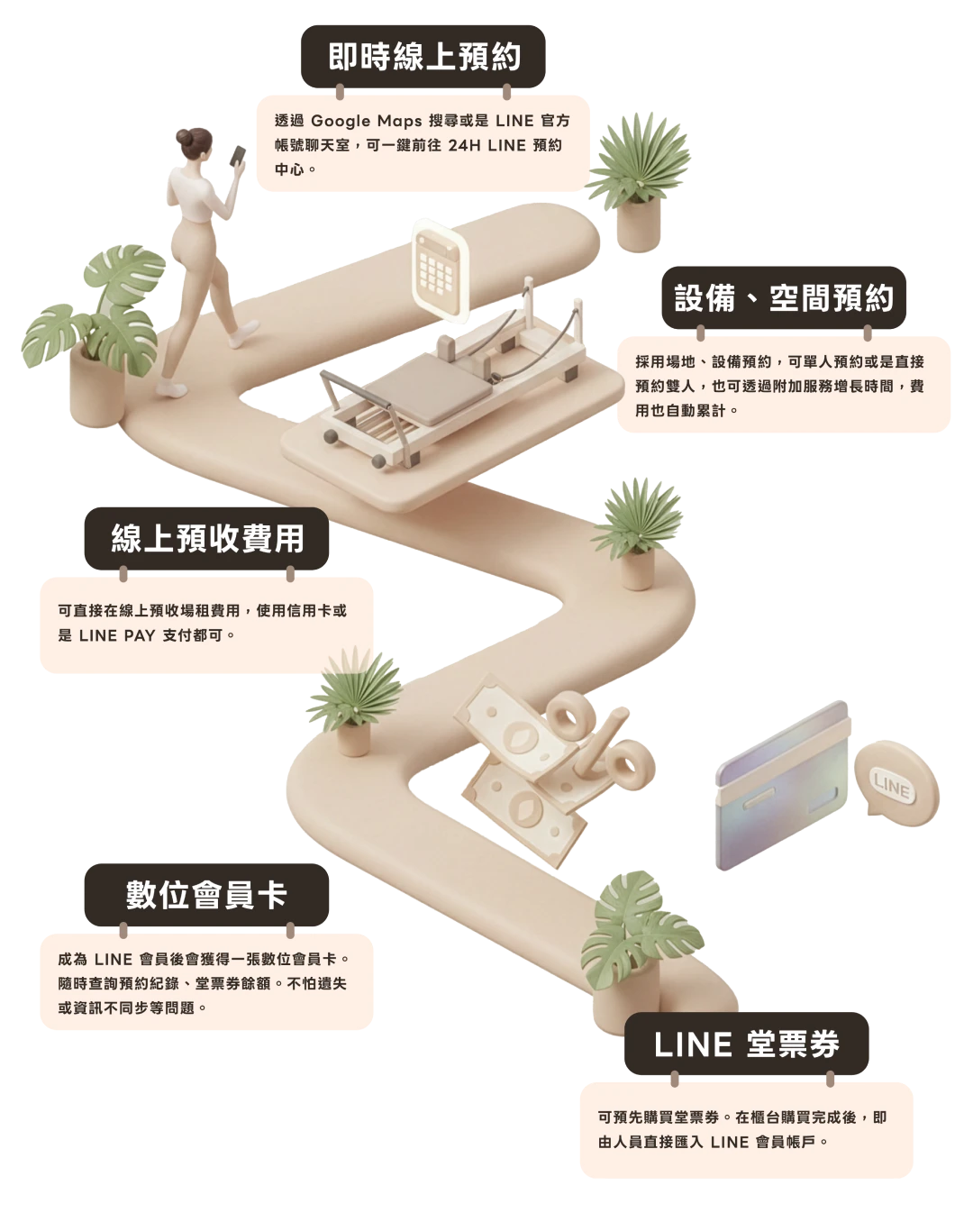 3 Pilates Studio 以生活歐巴 LINE 預約系統為基礎,提供即時線上預約服務,讓使用者能透過 Google Maps 或 LINE 官方帳號,隨時隨地進行預約。這項服務不僅涵蓋了設備與空間的單人或雙人預約,還能根據使用者需求延長使用時間,費用自動計算,提升了使用便捷性。 在預約確認後,用戶可直接在線上預付定金,支持信用卡及 LINE PAY 付款,這使得場地及設備的管理更為高效。