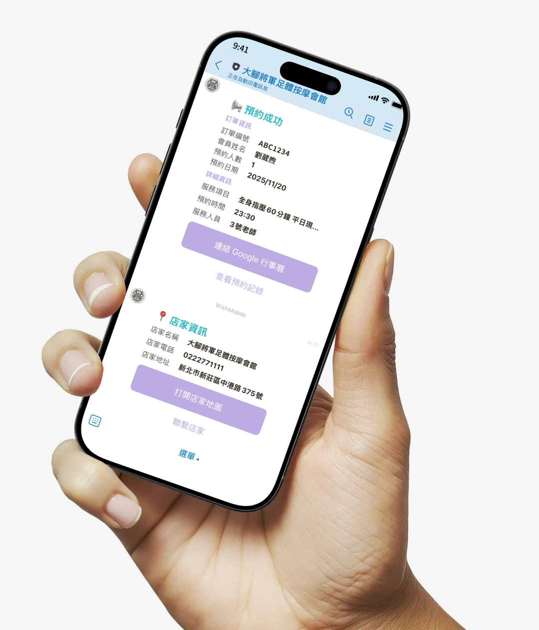 系統在預約完成後自動推播完整資訊與行前提醒,協助顧客清楚掌握服務時間與地點,也讓店家能更穩定地安排人力與時段。這樣的流程設計,特別適合具有多據點營運需求的養生按摩業者,有助於降低 No-Show 風險,同時維持服務品質的一致性,讓預約本身成為體驗的一部分,而非額外負擔。