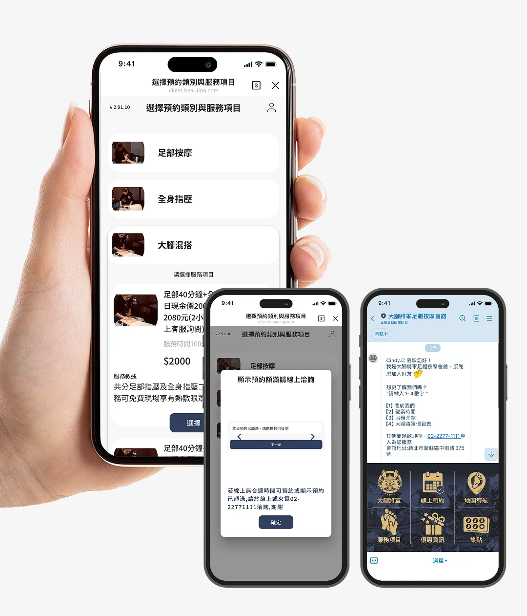 對於養生按摩品牌而言,預約與排程的清楚度,直接影響顧客體驗與現場運作效率。大腳將軍透過生活歐巴 LINE 官方帳號整合線上預約與服務資訊,讓顧客能在熟悉的介面中完成療程選擇、時段安排與老師指定,不論選擇哪一個據點,都能依相同流程完成預約,避免因資訊落差而產生混亂。