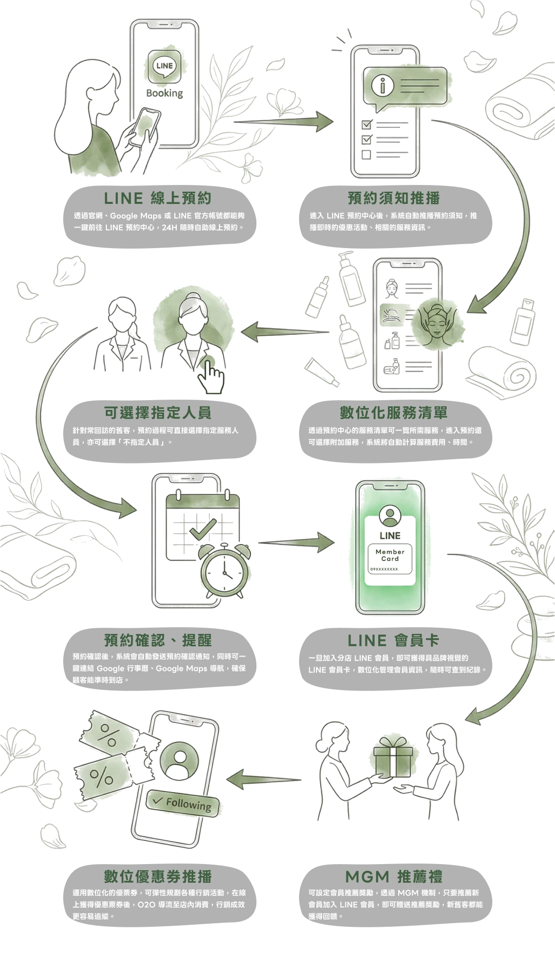 在預約過程中,顧客能輕鬆找到所需服務,並可選擇指定服務人員,使得常回訪的顧客體驗更佳。預約後,LINE 會自動發送確認通知與提醒,並可一鍵連結 Google 行事曆,確保顧客準時到店。加入 LINE 會員後,顧客可獲得數位會員卡,方便管理預約紀錄及即時獲取最新優惠訊息。
