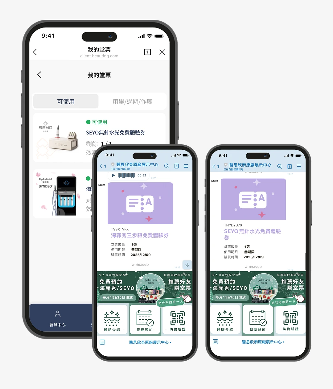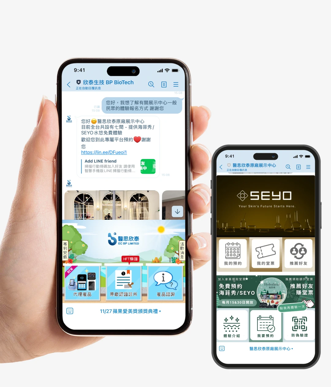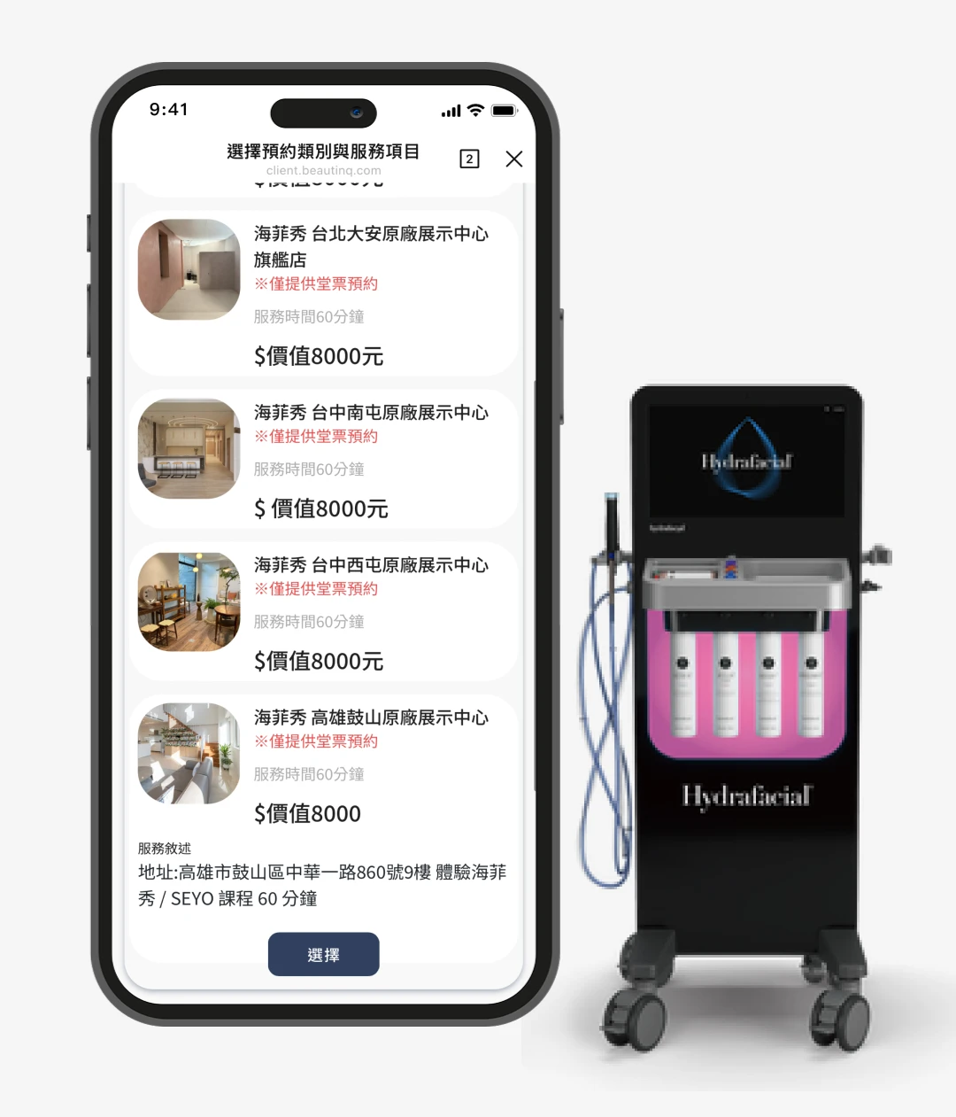 醫思欣泰透過美業歐巴 LINE 預約系統,為顧客提供便捷的美容儀器預約服務。首先,顧客可透過官方 LINE 帳號一鍵前往展示中心進行預約,加入好友後可輕鬆找到預約按鈕,實現線上體驗預約。此外,加入會員後,顧客將獲得自動推播的免費體驗券,這些體驗券可用於預約海菲秀或 SEYO 體驗,讓顧客在享受服務的同時感受到品牌的誠意。