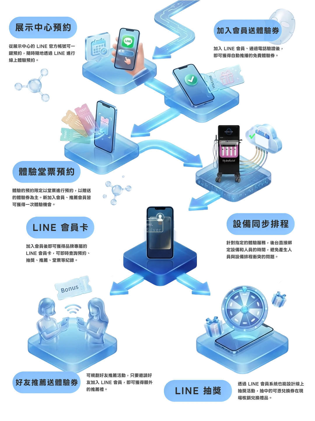 為了提升預約效率,系統還提供設備同步排程功能,確保顧客能在適當的時間使用所需的美容儀器,避免排程衝突。顧客在預約後可隨時查詢自己的預約紀錄,並透過 LINE 系統輕鬆調整或取消預約,這一點大大提高了顧客的便利性。此外,透過好友推薦活動,顧客能獲得更多的體驗券,進一步促進品牌的口碑行銷。