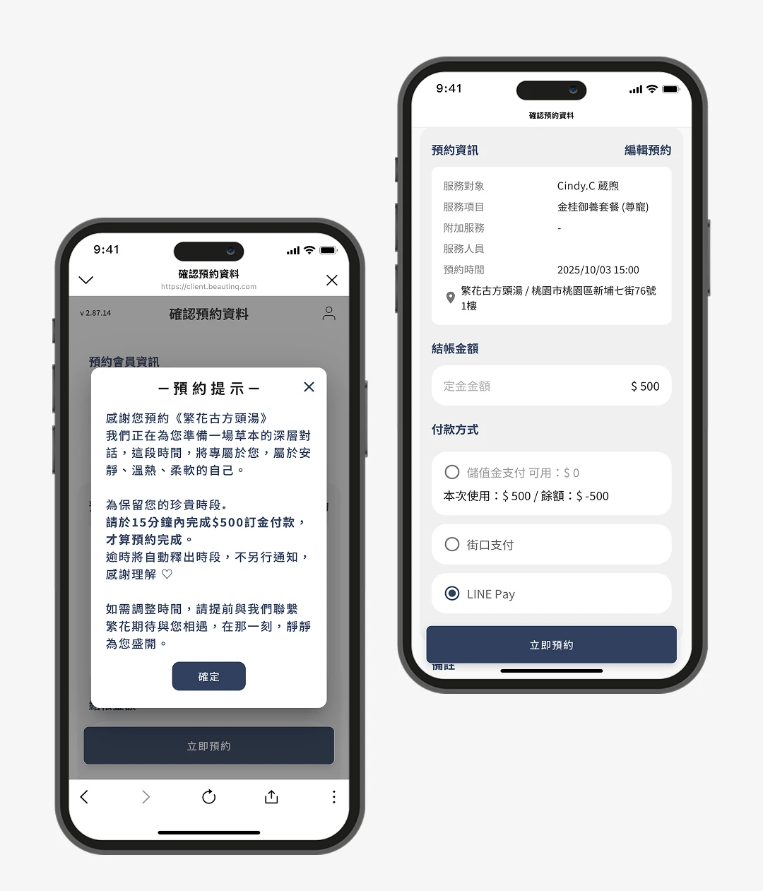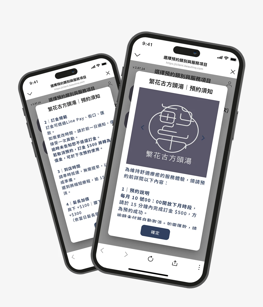 透過 LINE 官方帳號進入預約中心時,客人即可看到專屬的開幕優惠套餐,點擊即可看到套餐內容與服務介紹,減少疑慮與溝通成本;而在預約之前的須知跳窗,清楚提示預約政策 ( 例:開放時間、訂金規範、加價項目等 ),讓「期待」與「實際流程」更一致。