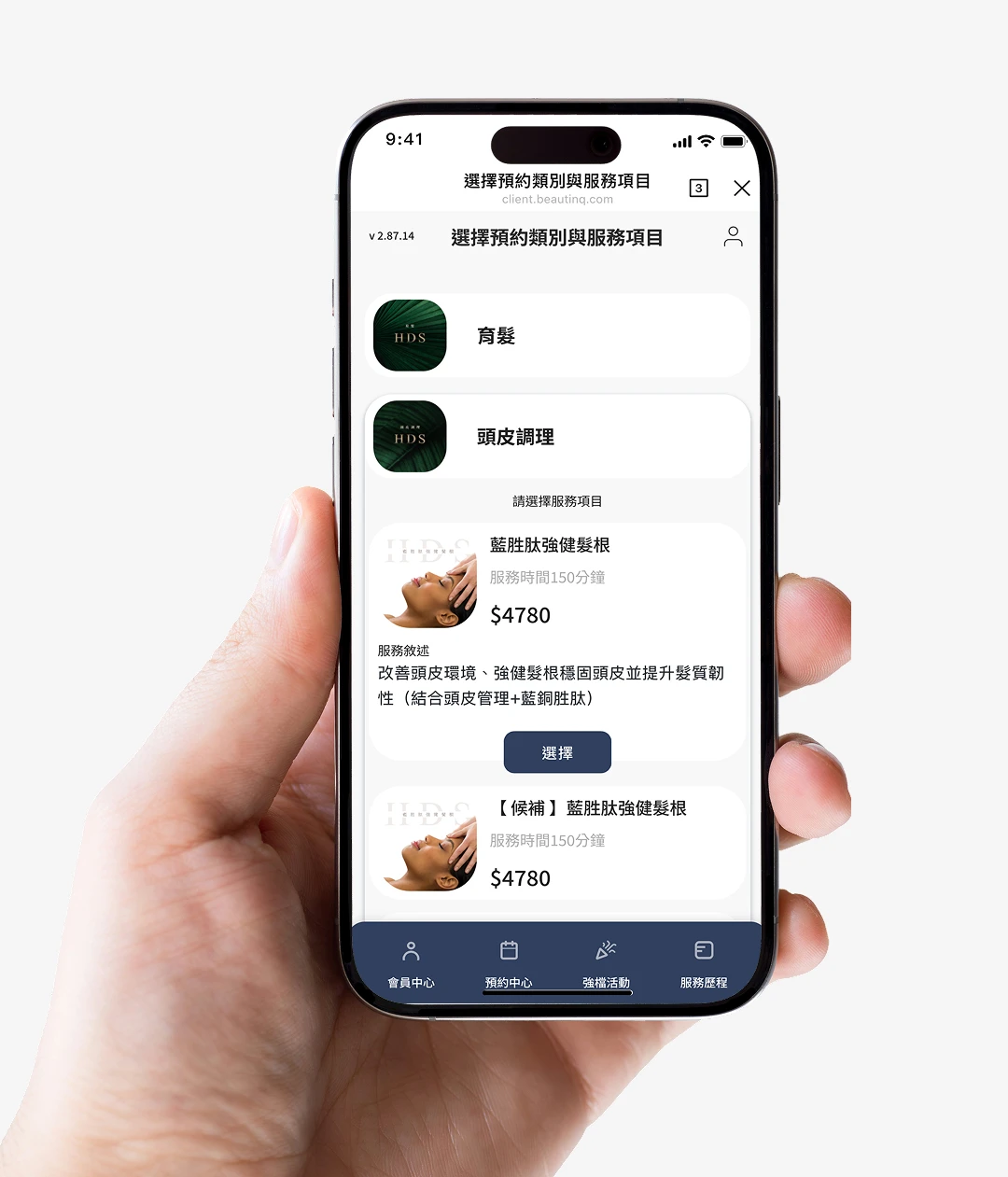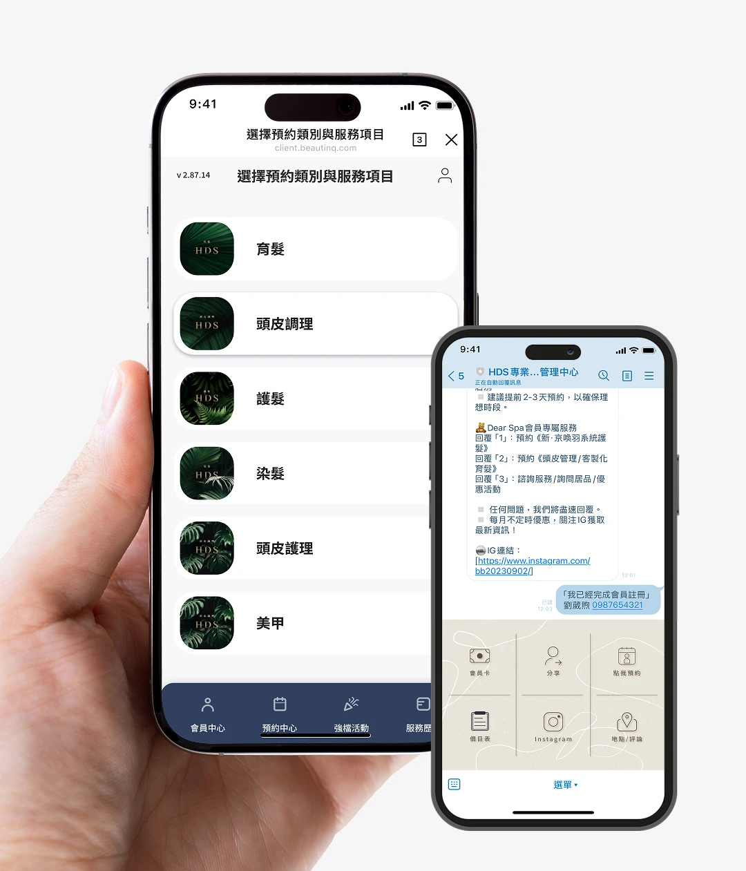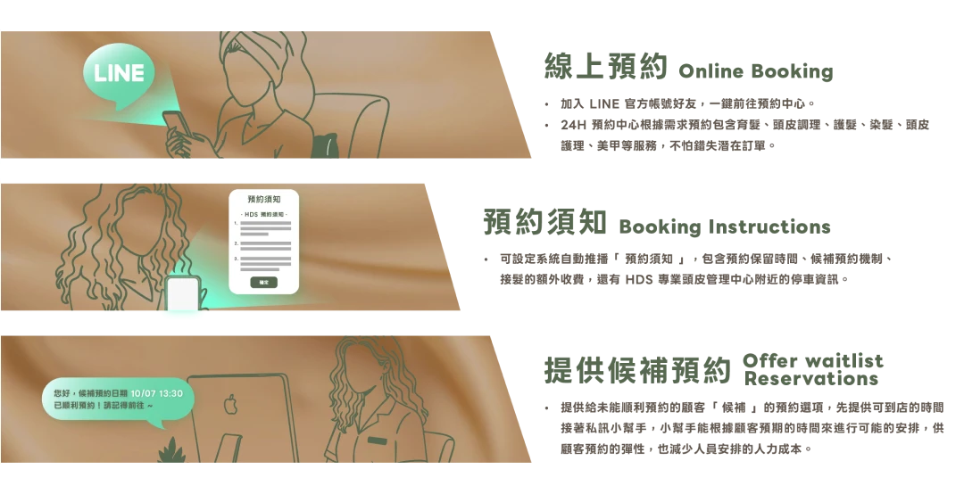 HDS 專業頭皮管理中心在採用美業歐巴 LINE 預約系統後,他們將線上預約流程變成顧客入口的關鍵起點。只要進入 LINE 官方帳號聊天室,顧客即可透過圖文選單一鍵點入預約中心,自助選擇包括育髮、頭皮調理、護髮、染髮、頭皮護理與美甲等服務。這 24 小時開放的系統不僅讓顧客更方便下單,也大幅節省人工接單成本。對於無法即時預約但仍有需求的顧客,HDS 運用「候補預約」機制:顧客可在系統留下可到店時間,接著小幫手私訊協助尋找調度空檔。這種彈性安排不僅提升顧客滿意度,也減少人工協調的時間成本。