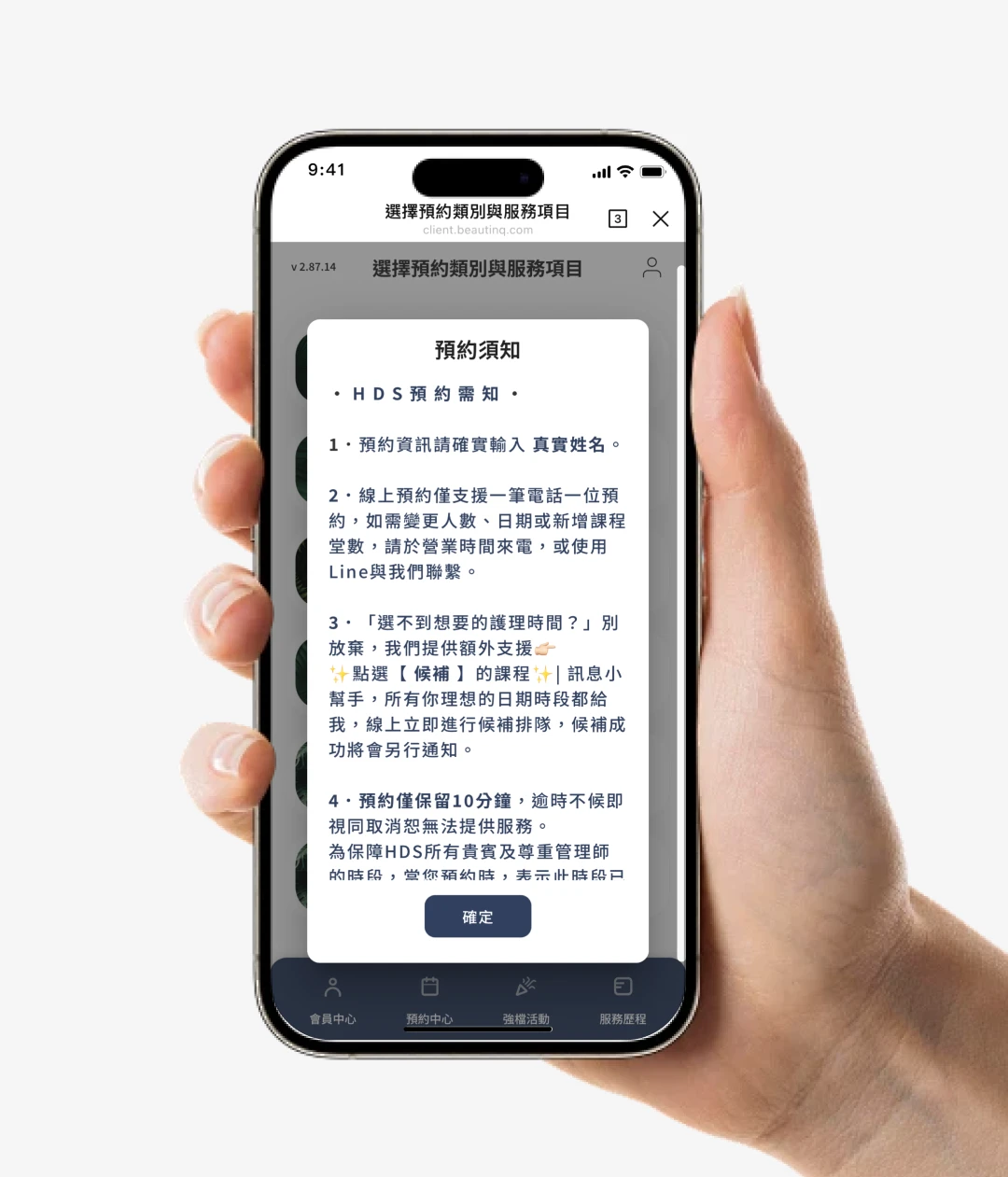 另一方面,預約中心會在顧客進入時自動推播「預約須知」,清楚說明保留時間、候補機制、接髮附加費、附近停車資訊等,提前建立消費共識,降低到店當天的爭議風險。