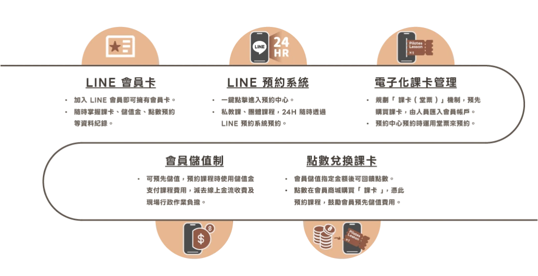透過 LINE 官方帳號聊天室即可加入 LINE 會員,在註冊時填寫訂製表單 ( 包括運動目的、健康狀況、品牌資訊來源等問題 ),讓教練團隊可以預先掌握學員需求,提供客製化的課程建議與服務。會員加入後即可在 LINE 中查看自己的課卡 ( 堂票 )、儲值金額、點數餘額,以及預約狀態與紀錄。