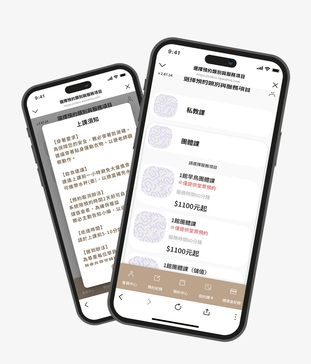 在預約機制上,會員可透過 LINE 官方帳號一鍵進入預約中心,系統會自動跳出「上課須知」提醒 ( 如著裝、飲食、到課規範等 ),建立課前共識。無論是私教課或團體課程,皆可線上選擇以堂票 / 課卡或儲值金支付,24小時都能透過系統預約。