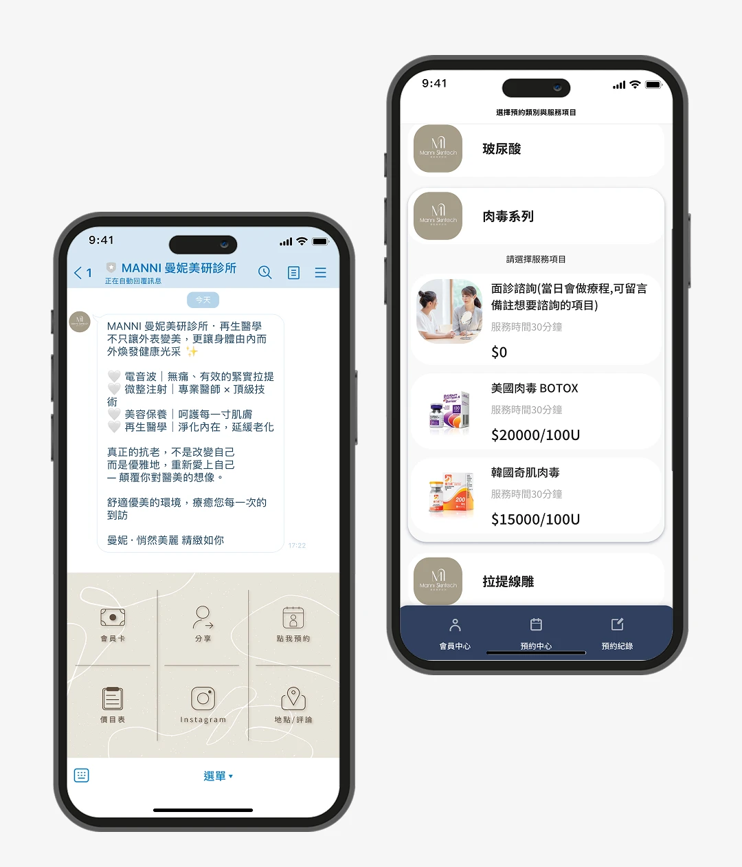 MANNI 曼妮美研診所與美業歐巴 LINE 預約系統合作,將預約、醫師管理與會員資料完整串接,形成數位化的一站式服務。顧客只要透過 LINE 官方帳號,就能一鍵進入預約中心,瀏覽服務描述並直接預約,24 小時皆可完成操作,不受診所營業時間影響。診所內部也透過「醫師與設備綁定」降低資源衝突,顧客在選擇醫師或指定設備時,系統會自動比對醫師班表與營業時間,只顯示可預約時段。