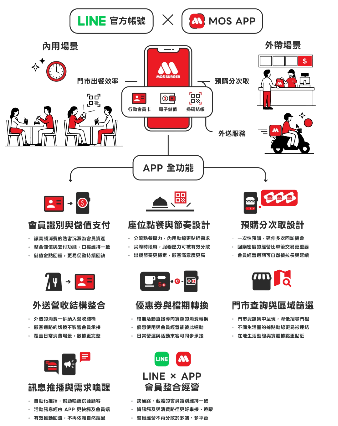 另一個更關鍵的要素,在於連鎖餐飲的消費路徑早已不只發生在櫃檯前。會員可能透過 APP 儲值、領券、點餐,也可能透過 LINE 接收活動資訊,再回到門市完成消費;也可能在內用、外帶與外送之間切換。當消費場景愈來愈多,品牌真正需要的,便不是單點功能增加,而是讓會員識別、優惠承接、取餐節奏與行銷觸達維持同一口徑。