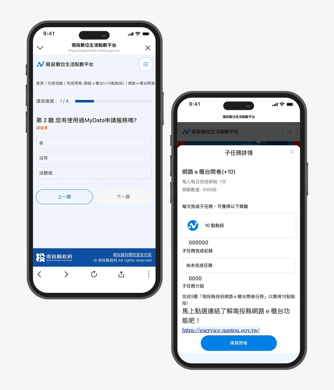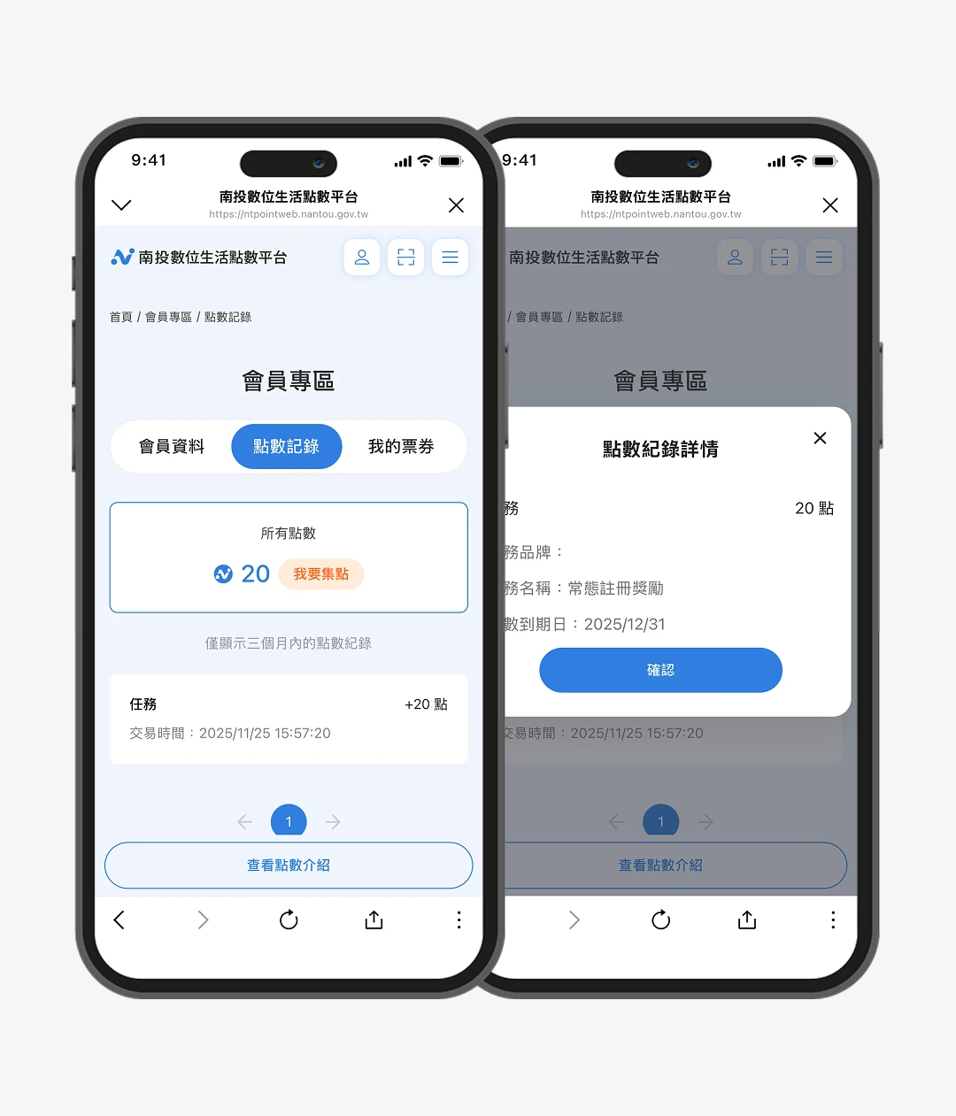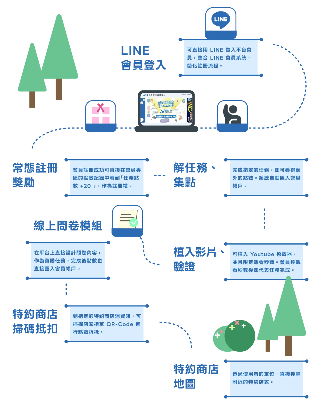 南投數位生活點數平台為在地居民及遊客提供便利的會員體驗,用戶僅需利用 LINE 會員登入,簡化註冊流程,輕鬆成為平台會員,並立即獲得註冊獎勵點數「任務點數 +20」。平台設計的多樣任務,如觀看影片、回答問卷或註冊其他平台會員,讓會員在達成任務後,自動獲得額外點數,進一步提升互動性。