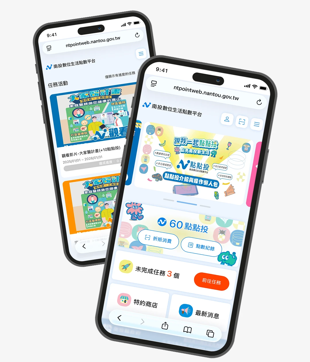 南投數位生活點數平台「點點投」是由南投縣政府推出的數位集點回饋平台,民眾只要透過完成平台上的任務或參與縣府活動,就能獲得數位點數。這些任務包括政策宣導問答、活動報到、掃碼挑戰等簡單互動,任務完成後即可累積點數 ( 1 點等於 1 元 ),讓民眾在日常生活、旅遊或參與活動時,都能輕鬆賺取獎勵。累積的點數可在南投縣內的特約商家進行消費折抵,特約合作店家包含觀光工廠、商圈美食、旅宿與文創店鋪等多種類型,覆蓋日月潭、埔里、集集等熱門景點與商圈,提升在地消費便利性與優惠體驗。