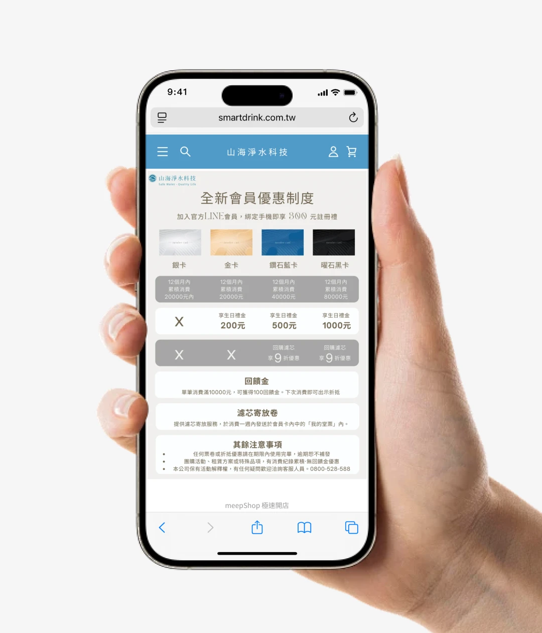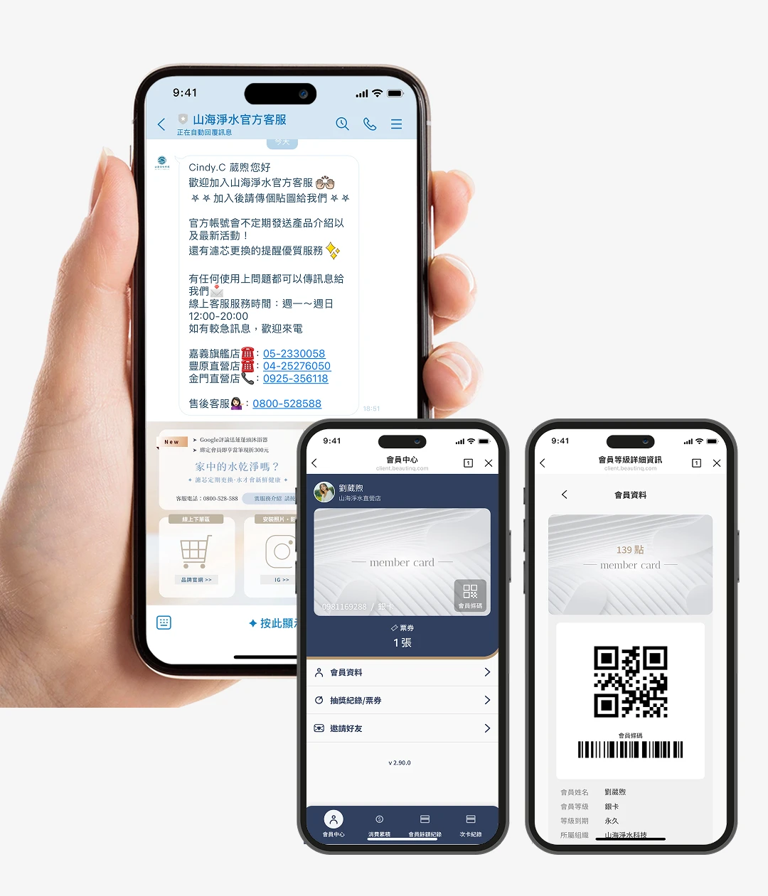 在數位轉型的過程中,山海淨水科技導入了生活歐巴 LINE 會員系統,讓會員經營更貼近現代消費者的習慣。顧客透過 LINE 官方帳號聊天室的圖文選單,即可一鍵申請會員註冊,透過 LINE 會員卡,可整合等級升級、票券發放與消費紀錄查詢等功能。相較於傳統以紙本或單純購買紀錄為主的會員管理模式,這套數位化工具不僅讓會員加入更方便,也讓優惠與權益能在第一時間被感知與使用。