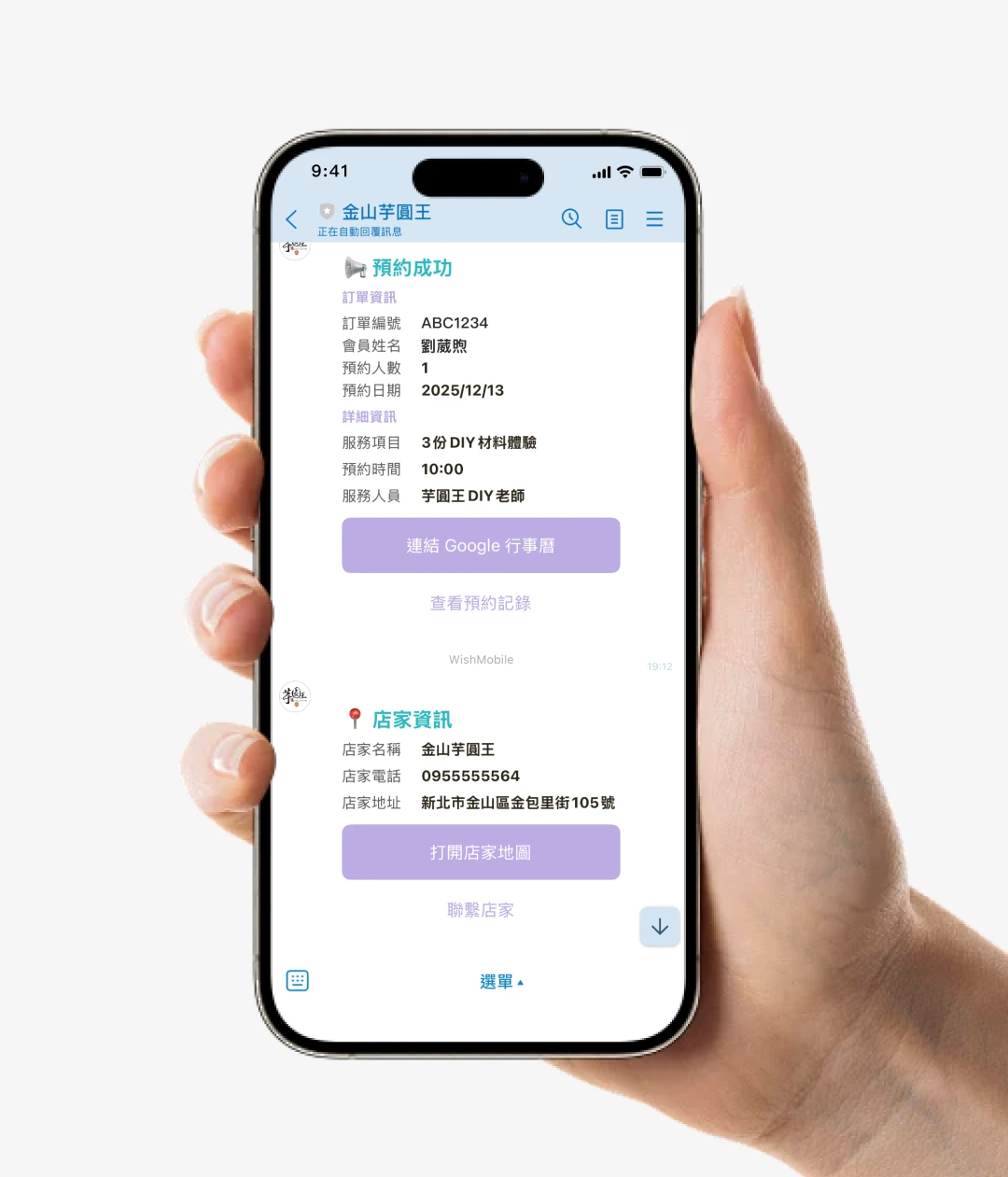 預約完成後,LINE 會推播預約確認訊息,並提供 Google 行事曆的連結,確保顧客能順利到達店鋪。此外,註冊成為 LINE 會員的顧客還可獲得數位會員卡,隨時查詢預約及取消資訊。