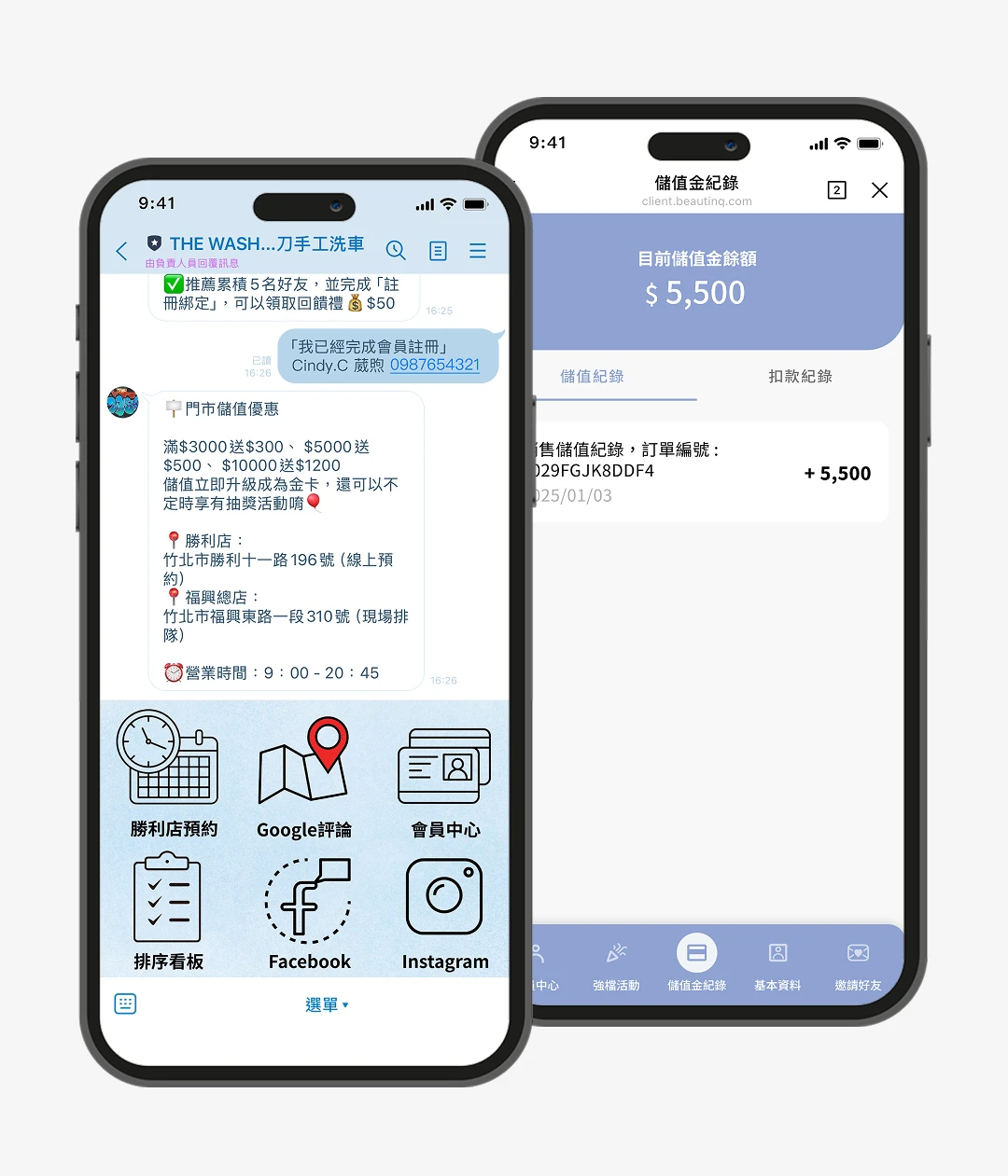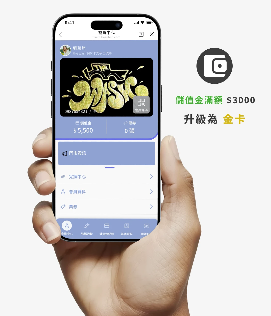 THE WASH 360° 透過生活歐巴 LINE 會員系統,提供了多項數位化功能,提升顧客的洗車、互動體驗。顧客加入 LINE 會員後,即獲得具品牌視覺的會員卡,隨時可查詢儲值金餘額與票券資訊,並能接收到店家的重要通知。會員在門市預先儲值可享優惠,滿 $3,000 送 $300,最高可達 $1,200,並可自動升級至金卡會員,享受專屬的推播與行銷優惠。( 最新活動內容請以 THE WASH 360 度水刀手工洗車 LINE 官方帳號 公告為主 )