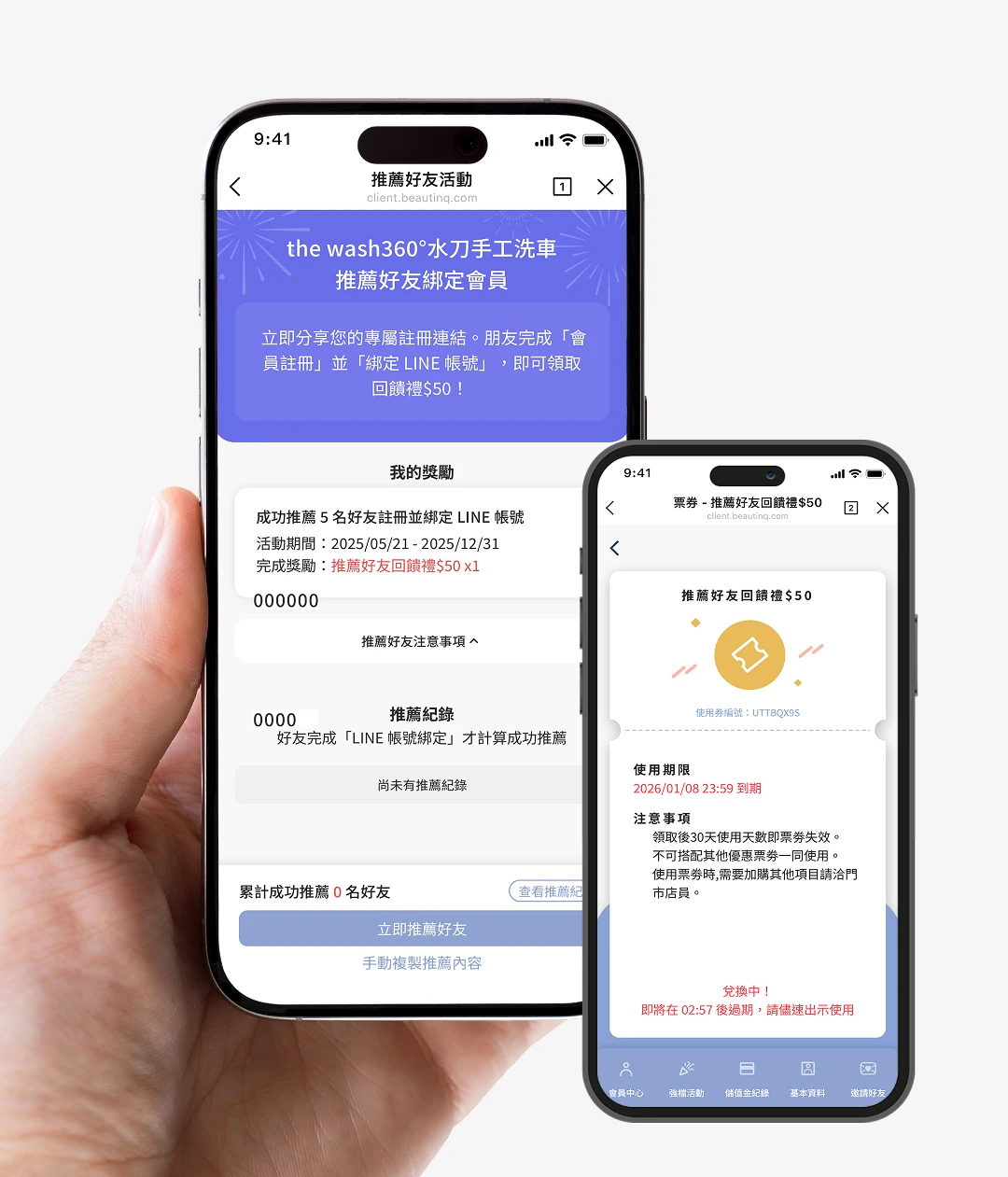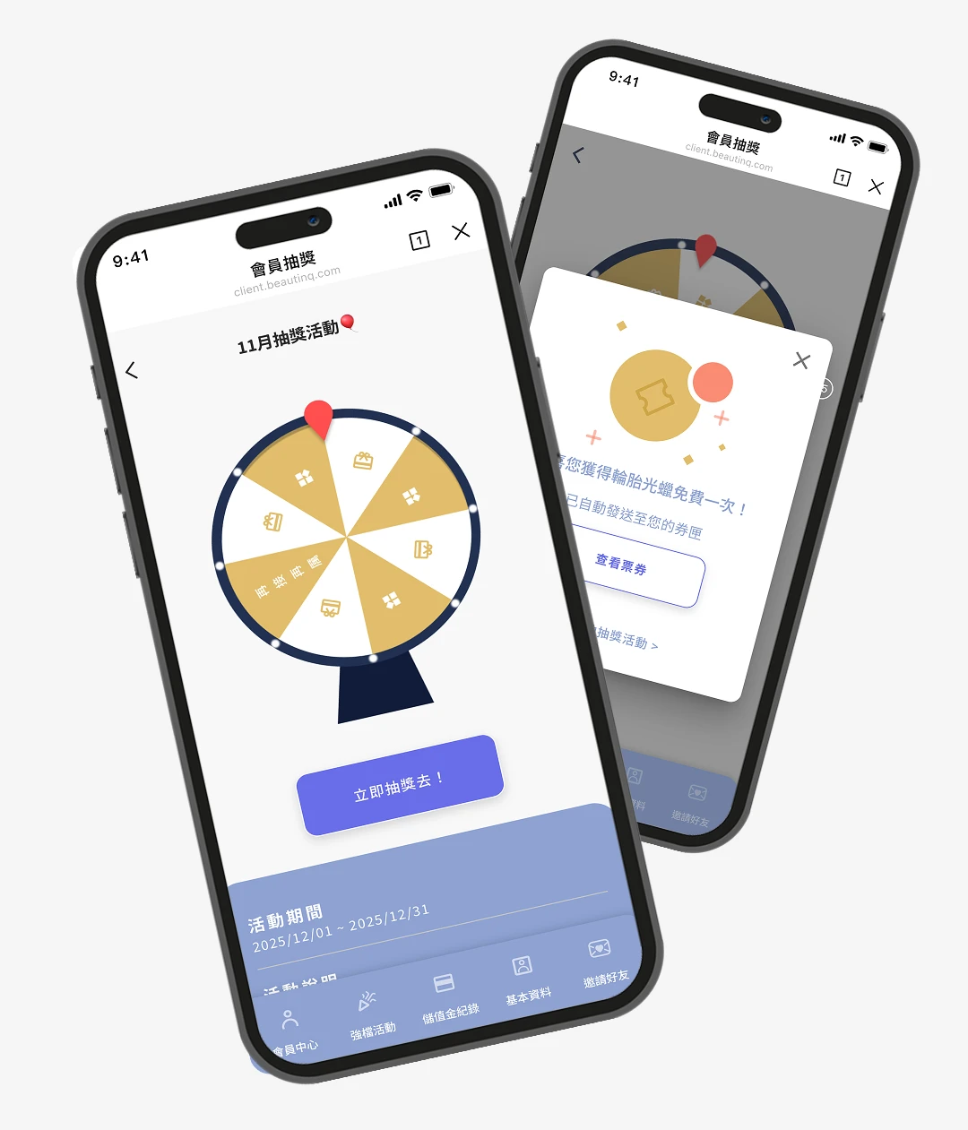 此外,THE WASH 360° 也提供線上抽獎推播,讓金卡會員有機會獲得兌換券,提升互動性。電子化票券的發放簡化了行銷活動的流程,並且推薦好友加入可獲得回饋券,進一步吸引新會員。