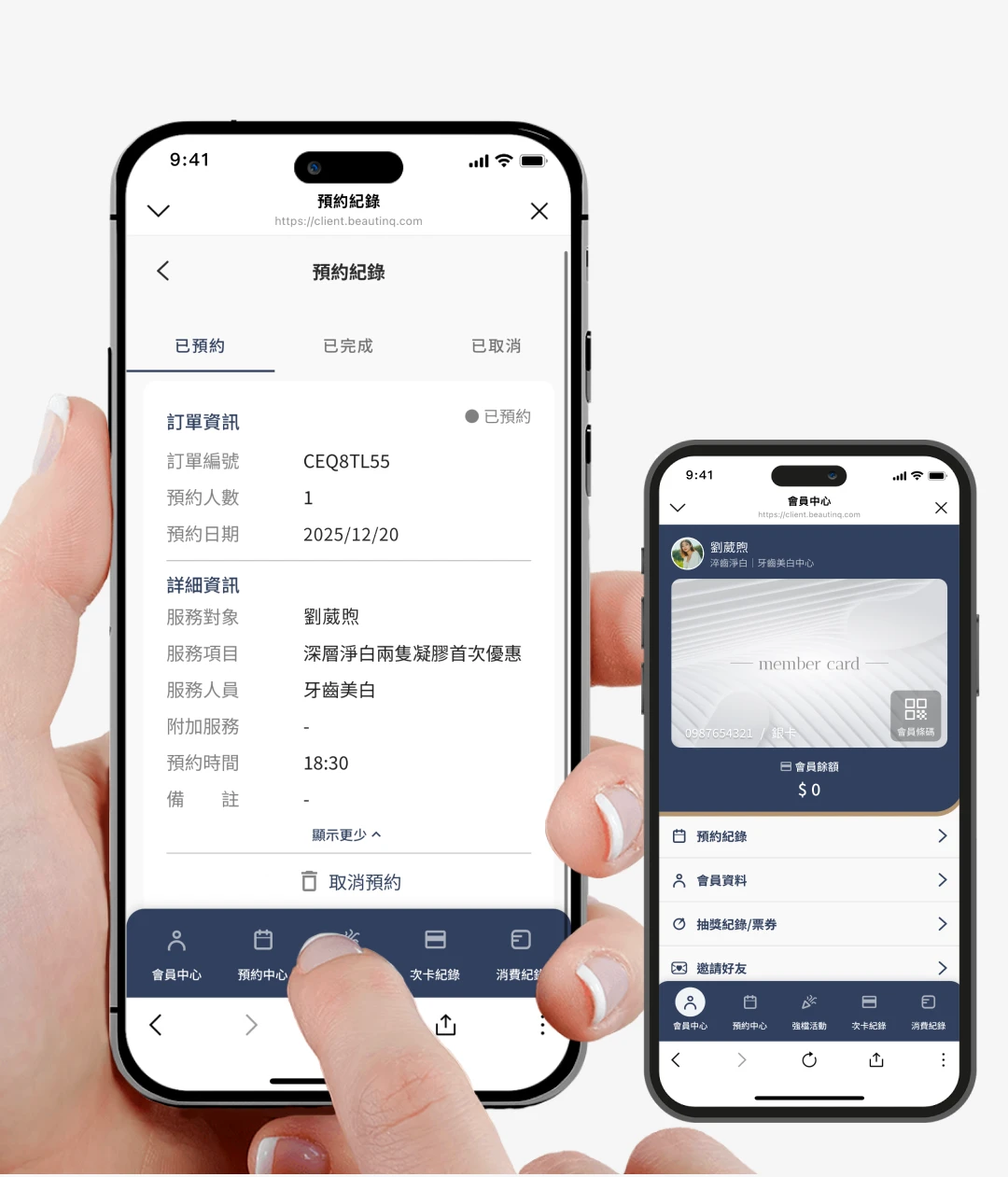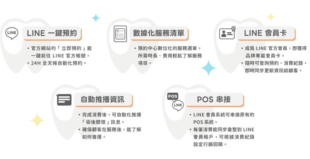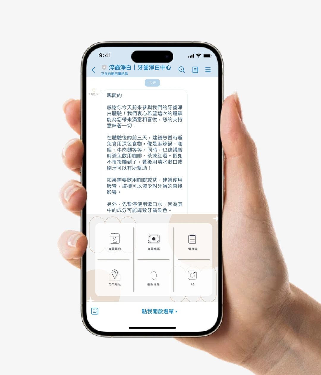 完成註冊後,系統會自動發行電子會員卡,顧客可隨時查詢預約與消費紀錄,資訊同步更新、無需紙本紀錄。療程結束後,LINE 會自動推播術後關懷訊息,提醒顧客避開深色食物、咖啡、茶飲等,協助維持亮白成效。