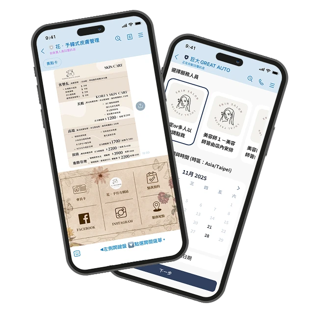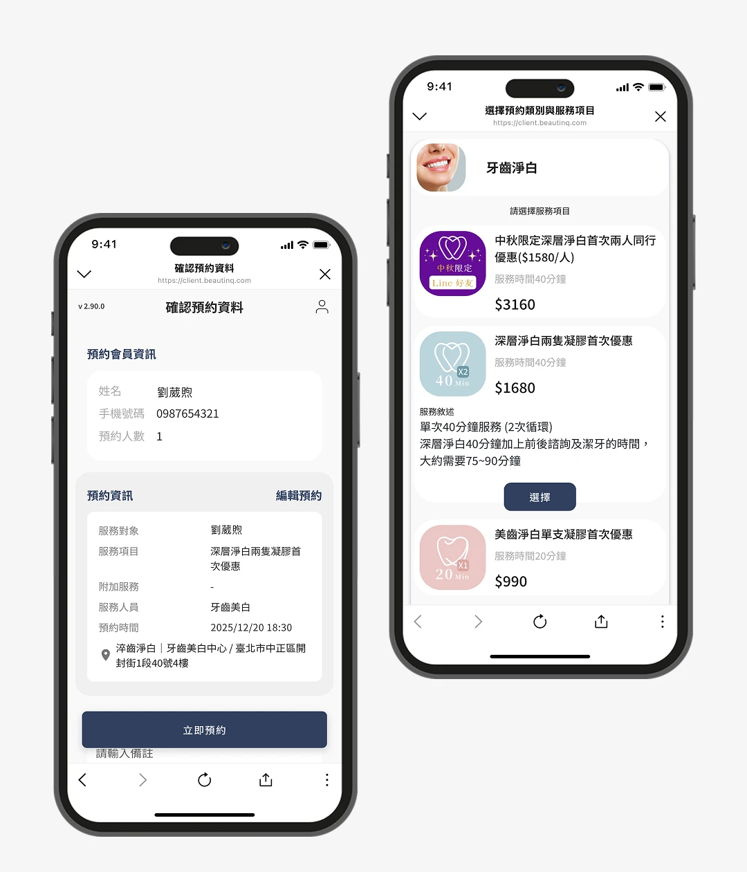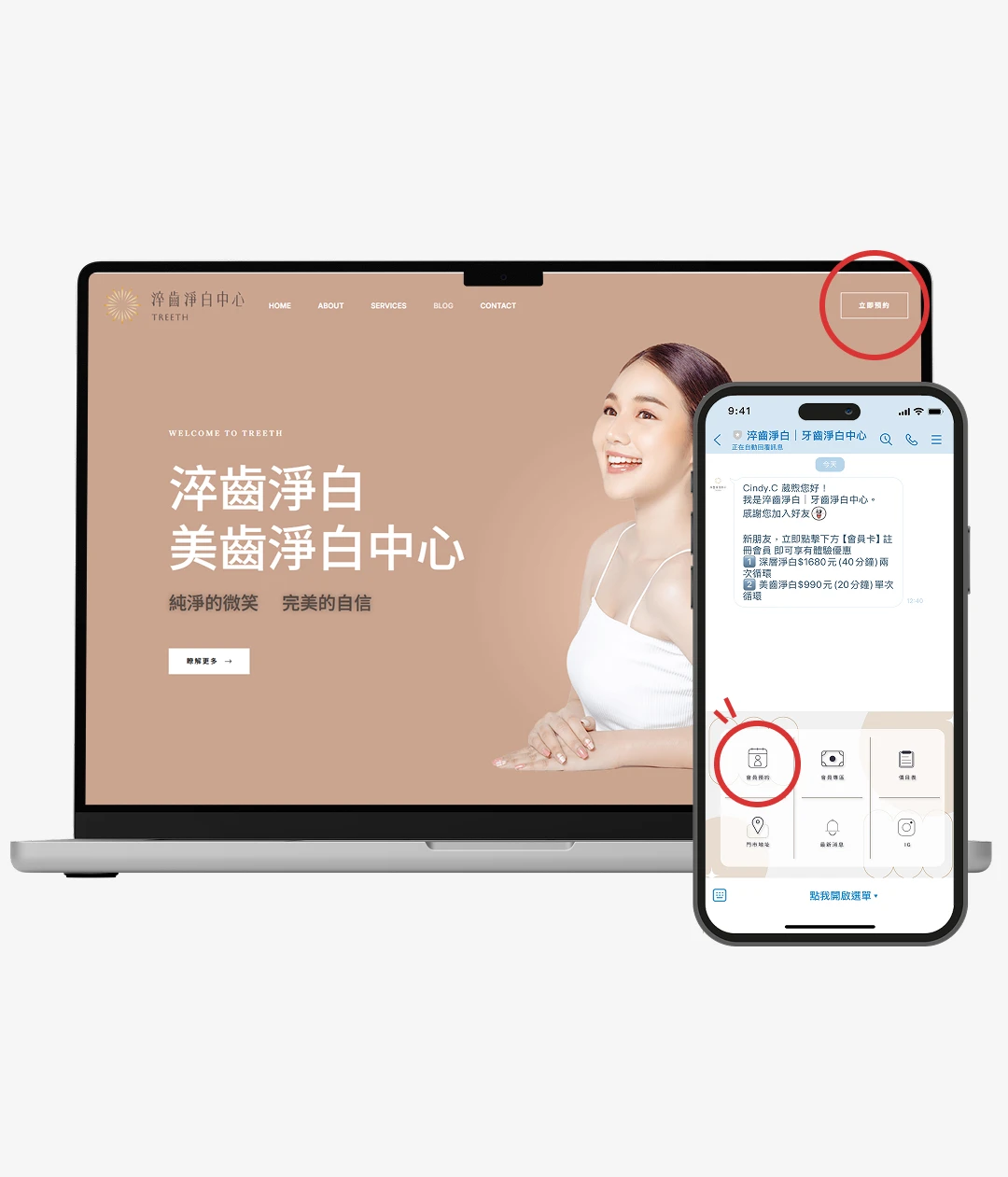 淬齒淨白導入美業歐巴 LINE 會員系統,讓整個服務流程自動化、數位化。顧客可從官網的「立即預約」一鍵跳轉 LINE 官方帳號,加入好友後即可透過圖文選單進入預約中心,全天候 24 小時開放預約,免除等待人工回覆的不便。預約中心中的數位化服務清單將每項療程的時間、費用與說明透明呈現,即便是第一次預約的顧客,也能在下單前充分了解內容。