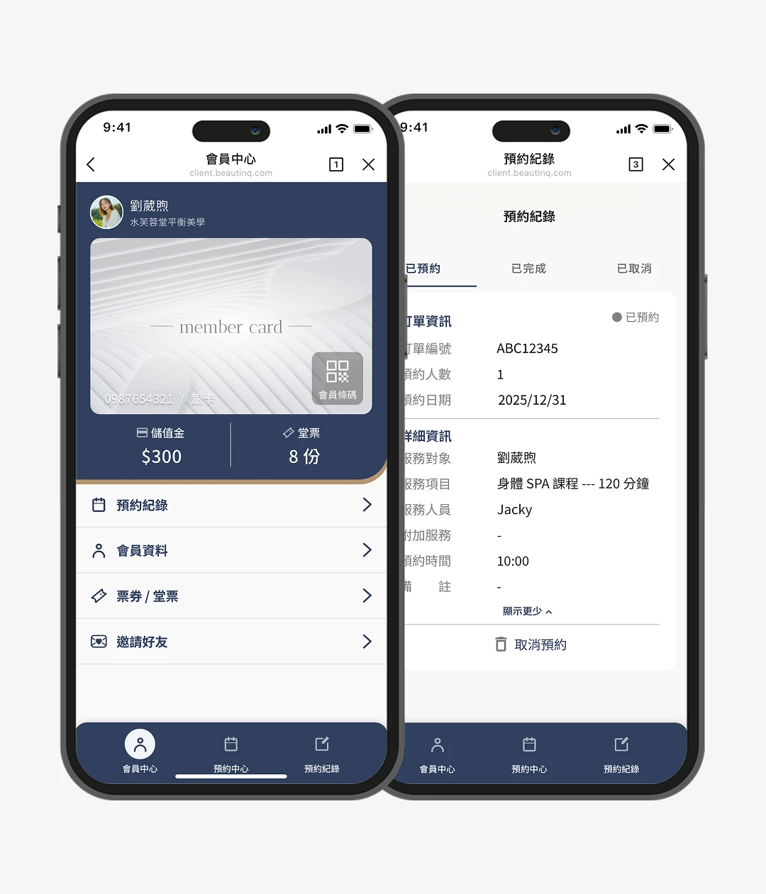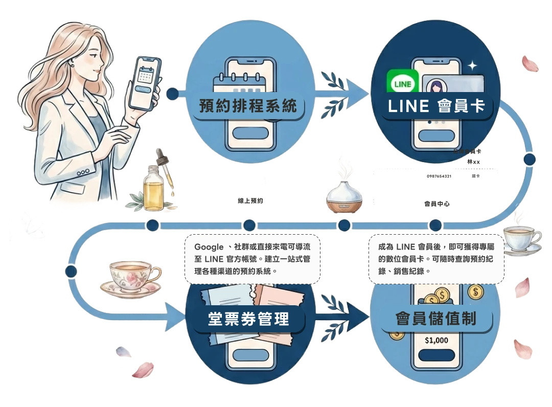 水芙蓉堂 Spa 透過美業歐巴 LINE 預約系統,實現了高效的預約管理與會員服務。該系統整合了多種預約渠道,顧客可輕鬆透過 LINE 或電話,由人員統一進行排程,不僅支持分館和服務項目的選擇,還能匯出預約行事曆,讓管理更加系統化。會員加入後,將獲得專屬數位會員卡,能隨時查詢預約和消費紀錄,這樣的設計讓顧客隨時掌握個人資訊,提升了用戶體驗。
