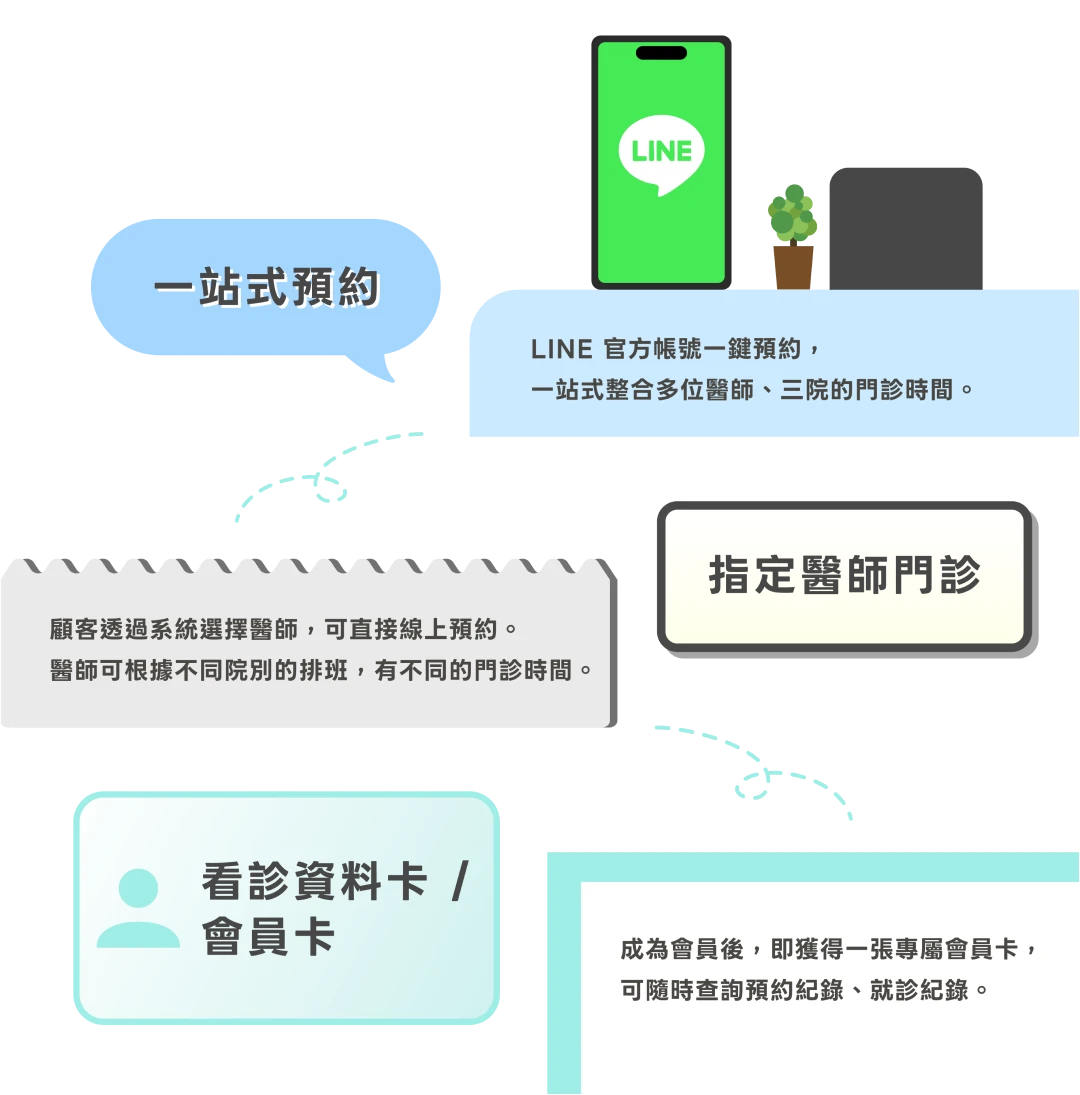指定醫師門診功能則解決了三院共同面臨的排班差異問題。即使是在三家院所都有門診的醫師,系統仍能依院區自動篩選可預約的時段,使民眾能迅速找到熟悉或最適合的醫師門診。搭配會員註冊後取得的看診資料卡,民眾可在 LINE 查詢個人的預約紀錄與就診紀錄,對正在進行長期減重管理的人來說,這讓療程進度更容易掌握。