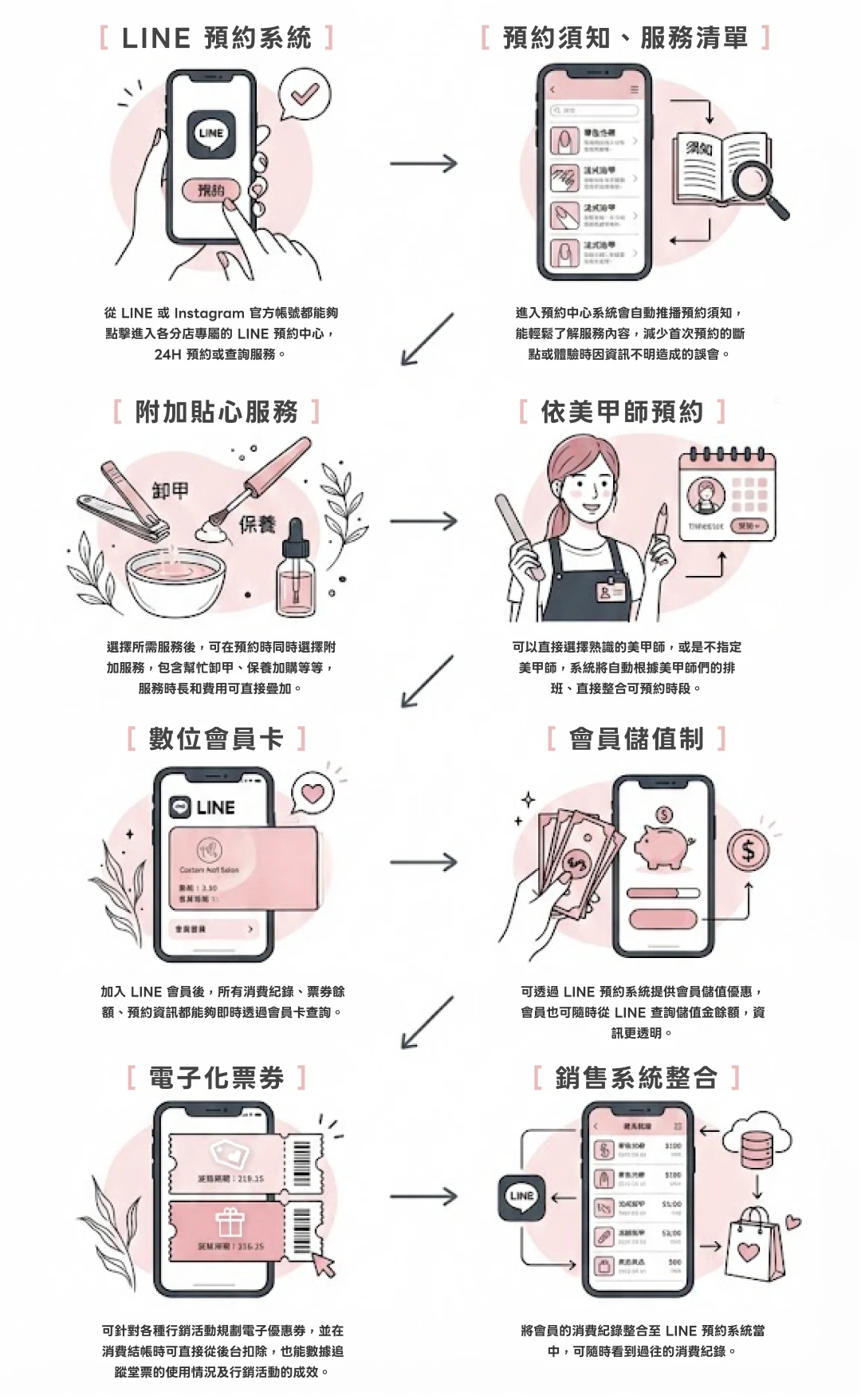 此外,顧客還可選擇附加服務,如卸甲或保養,並依照美甲師的排班選擇施作時間,系統將整合所有可預約時段,方便顧客選擇。透過數位會員卡和會員儲值制,顧客能隨時查詢消費紀錄、儲值金及票券餘額,增強對品牌的信賴度。電子化票券的導入也使得行銷活動更具效率,顧客可在消費時輕鬆使用優惠券。