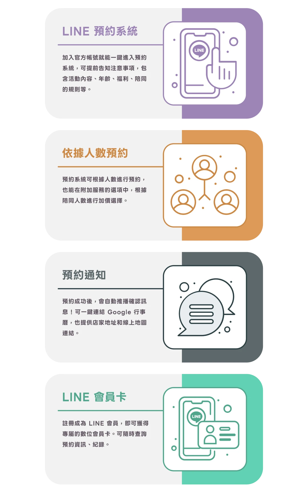 預約完成後,LINE 會推播預約確認訊息,並提供 Google 行事曆的連結,確保顧客能順利到達店鋪。此外,註冊成為 LINE 會員的顧客還可獲得數位會員卡,隨時查詢預約及取消資訊。